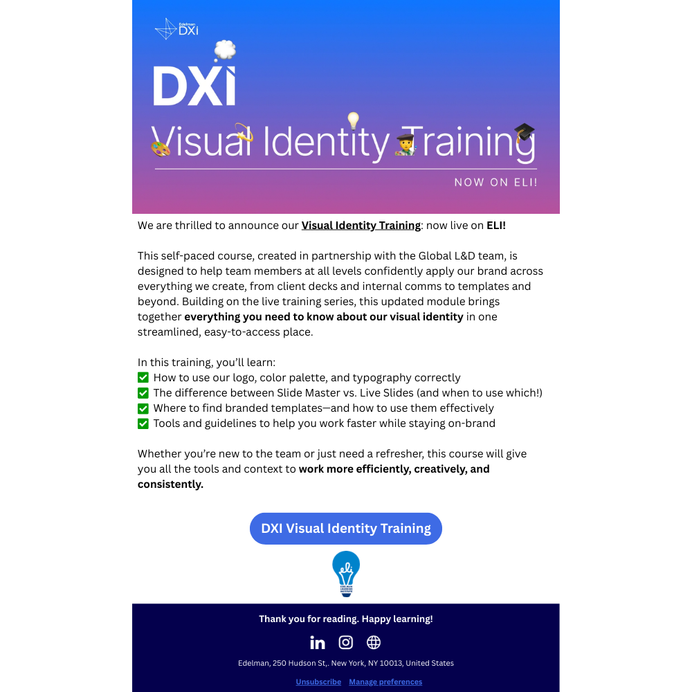 ImplementationI partnered with DXI stakeholders and the global marketing team to plan and execute the internal communications strategy for the course launch. Together we developed and distributed announcement messaging to all global DXI employees, positioning the training as the central resource for understanding and applying the company’s updated visual identity across presentations, communications, and client materials.