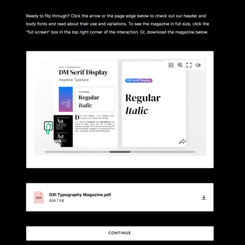 Designing this course pushed me to be more creative with Articulate Rise 360 since we did not have access to Articulate Storyline 360 at the time to build custom interactions. Working within those constraints, I explored ways to increase engagement using Rise’s existing features. For example, I created a flipbook-style magazine layout using Flipbook and Rise’s HTML block feature to present typography guidelines in a more editorial and visually engaging format, which the SME especially appreciated.